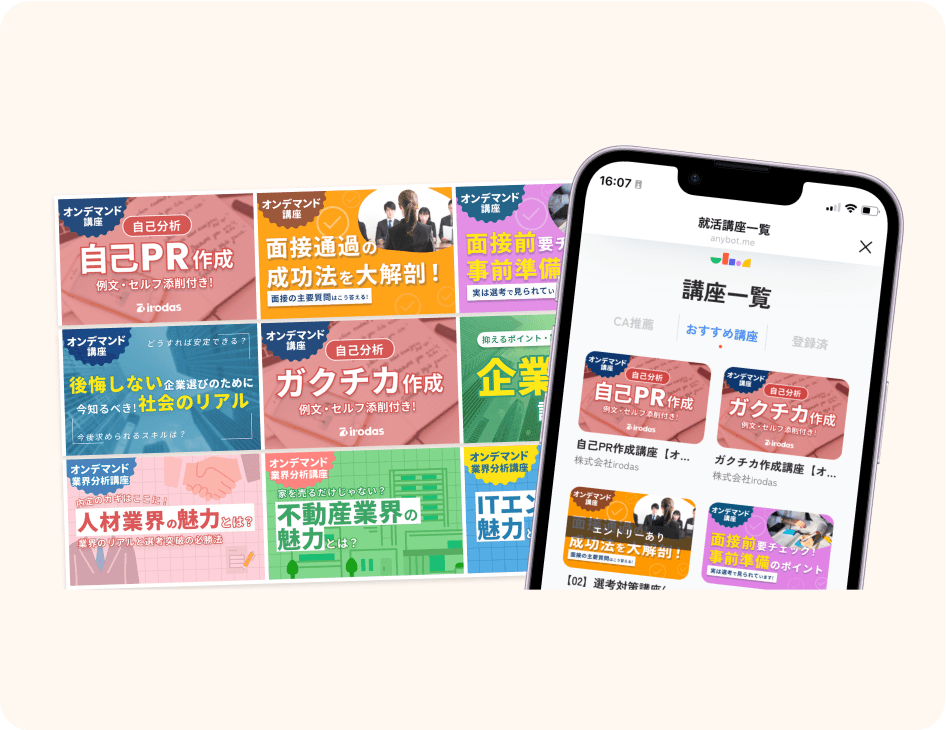 採用のエキスパートが監修した、オンデマンドの就活講座が見放題!選考前や授業の隙間時間で、自己分析や選考対策のポイントを学べます。